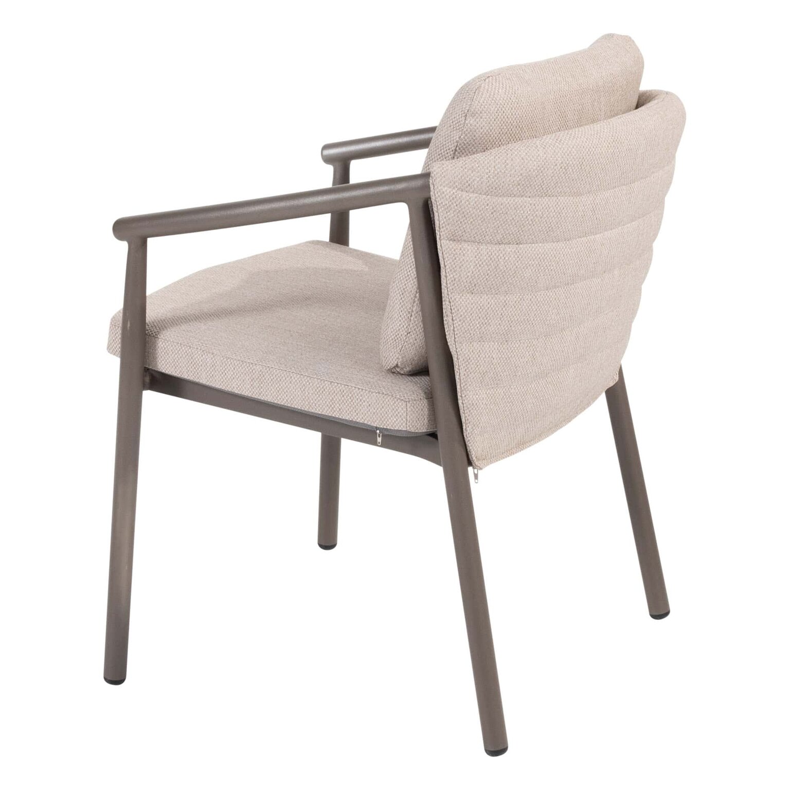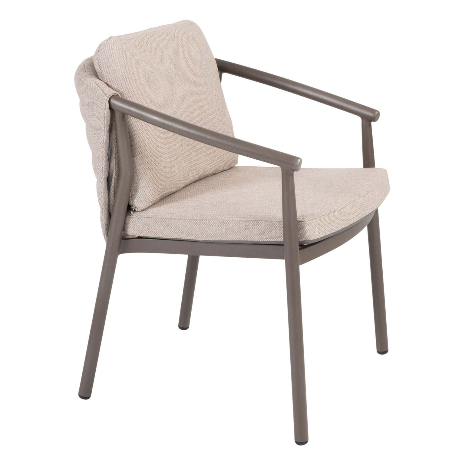 De Barolo dining stoel straalt warmte en comfort uit dankzij het elegante aluminium frame in Terre‑kleur en het comfortabele rope. De stoel wordt geleverd met een zit- en rugkussen voor extra steun.
