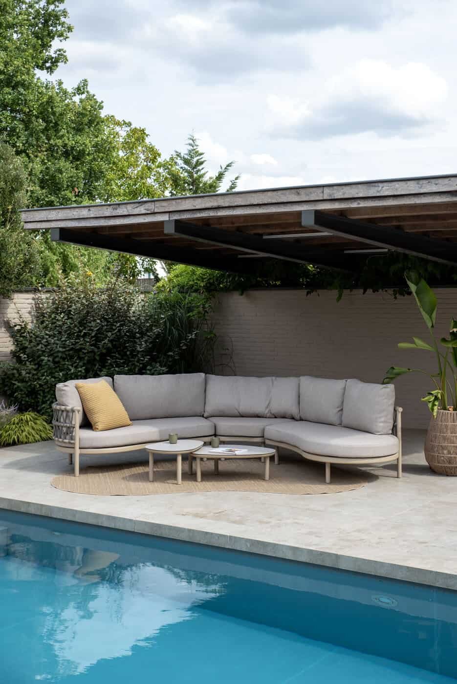 De Piacenza modulaire hoekset van Taste 4SO is ontworpen voor wie flexibiliteit en comfort zoekt. De set bestaat uit twee 2‑zits elementen en een XL hoekelement, uitgevoerd in rope met latte‑grijs kleuraccenten, en wordt geleverd met een set van twee Monroe salontafels met printed keramiek blad.