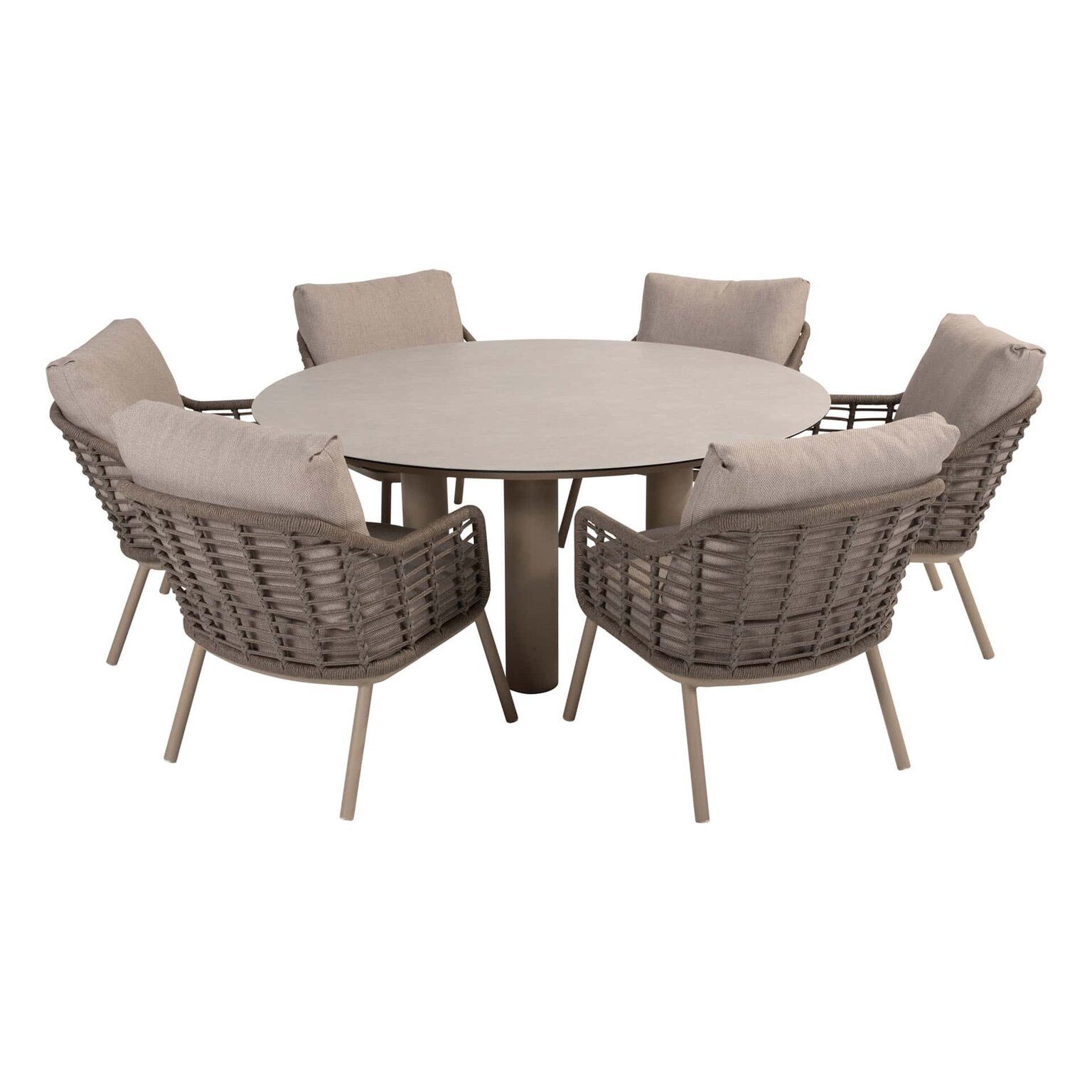- Zes Puglia low dining stoelen: rope‑vlechtwerk met all‑weather kussens in latte/taupe tinten;